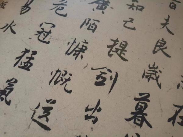 走近展厅,第一眼就会被沈尹默的一副丈二大字《为有·敢教》对联所吸引。沈尹默在这副行书中有意识地加入了枯笔,笔画更显苍劲老辣。“大家都知道沈先生擅长写小字,很少看见他的大字,其实他的大字也是一流。”张恒烟向澎湃新闻介绍:“这张作品有3米6高,是目前我们所知沈先生最大的一件作品,也是首次展出。这副对联内容也好,写的是毛主席的诗词‘为有牺牲多壮志,敢叫日月换新天’。此副丈二大字对联,让我们看到了沈尹默于精细雅致、秀逸婉转风格之外的另一种书写风格,即质朴苍茫、大气磅礴。”