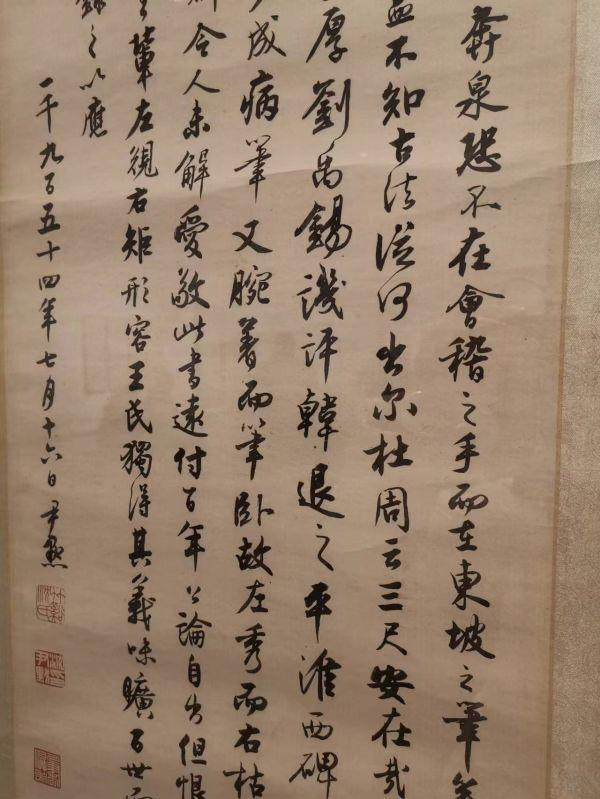 在展览入口处,可以看到多幅小字精品。沈尹默71岁时所书的一幅黄山谷《跋苏东坡水陆赞》,通篇清新雅致、婉转自然,形质与神采兼具。作品自上而下,前后照应,如"西施捧心而颦,虽其病处,乃自成妍"十数字,点画节奏明快,抑扬顿挫,时而沉着,时而飞扬,变化随心所欲又在法度之中。沈尹默强调书家在对"法"与"势"的转化中最应注意的是对毛笔的提与按,只有明晰提按关键处笔锋才不至于缠扭起来,从而"万毫齐力,平铺纸上"。从此幅行书黄山谷题跋条幅中可以看出,沈尹默的书法实践与其书学主张是互为表里、相互促进的。