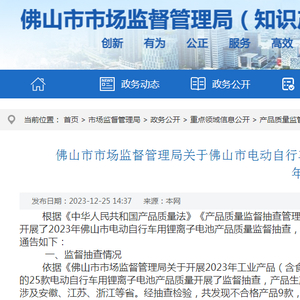 广东省佛山市市场监督管理局关于佛山市电动自行车用锂离子电池产品质量监督抽查情况的通告(2023年第36号)