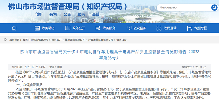 佛山市市场监督管理局关于佛山市电动自行车用锂离子电池产品质量监督抽查情况的通告(2023年第36号)