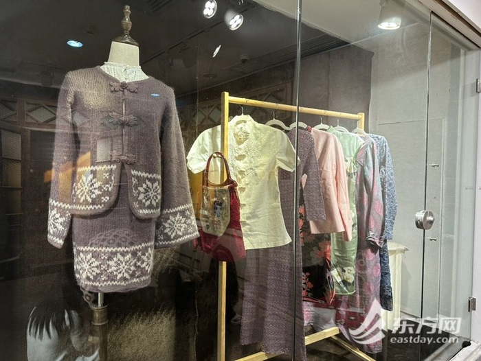 “冯秋萍们的编织世界”是此展览中的一大亮点。在类似近代上海石库房的展览场景中,陈列着旗袍、套装、学生装等各类近代时装,展示了20-30年代上海毛纺织业的繁荣。冯秋萍、黄培英是绒线编织的代表人物,她们不仅积极开办编织学校,也编写了多部绒线编织教材。