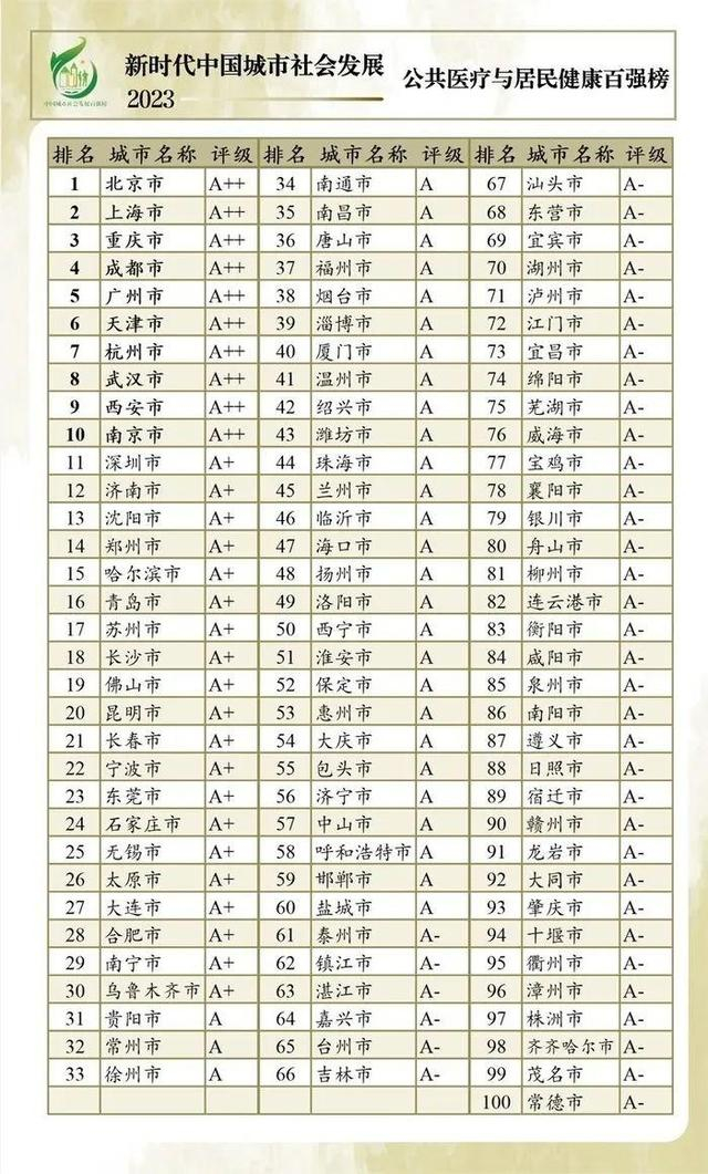 上榜百强城市分为A++级(1-10名)、A+级(11-30名)、A级(31-60名)、A-级(61-100名)四个等级。2023年城市社会发展指标体系包括7个一级指标、47个二级指标,从多个层面对297个地级以上城市的社会发展状况进行综合评价。一级指标分别为经济发展与民生建设、人口发展与社会潜力、生态文明与环境治理、社会治理与社会服务、文化教育与科技创新、公共医疗与居民健康、社会保障与社会救助。