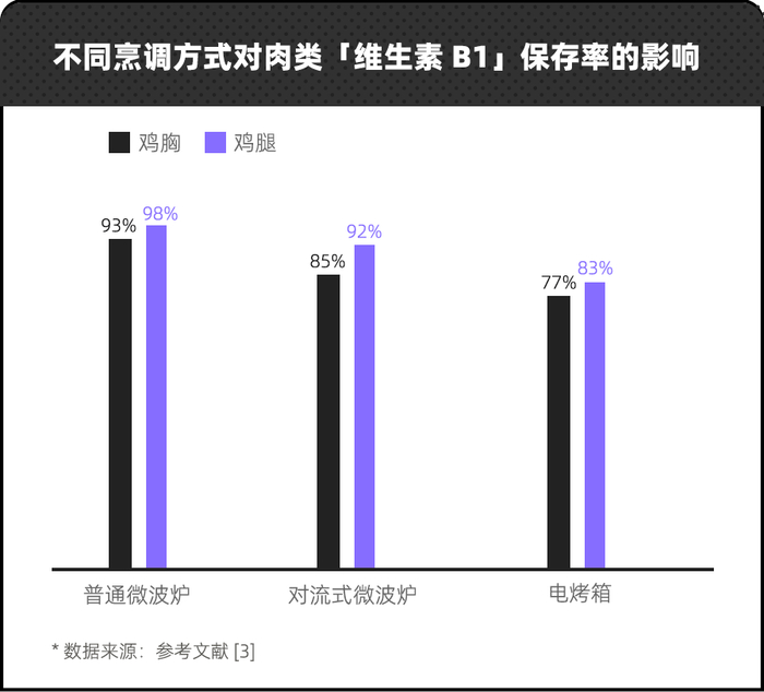 科研人员把新鲜鸡肉放在普通微波炉、对流微波炉、传统烤箱中加热到中心温度为 79°C,测定维生素 B1 的保留率,发现两种微波加热方式均高于烤箱。