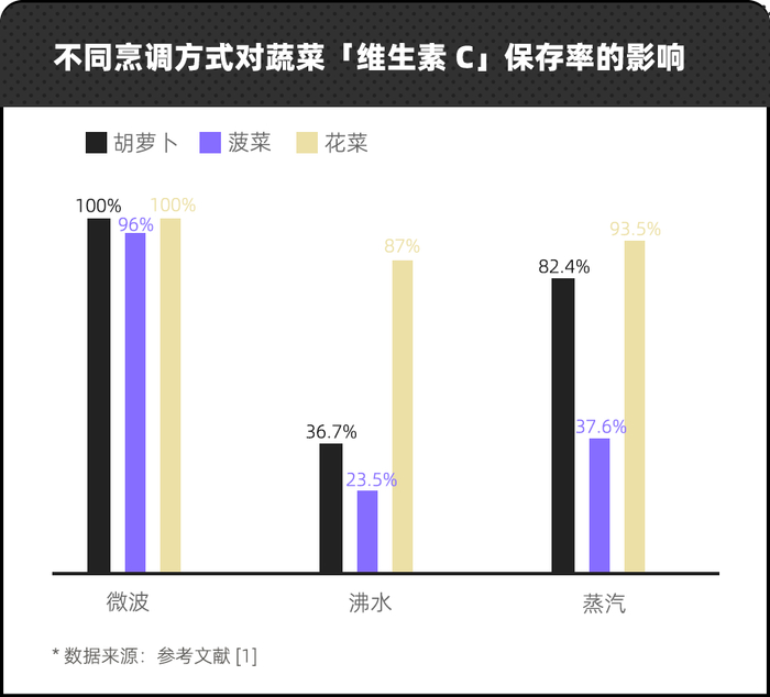 而研究发现,在达到同样熟度的条件下,微波蔬菜维生素 C 的保留率显著高于水煮菜,同时也不输健康的蒸菜。