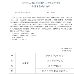 新华财经福州12月27日电(胡宇昊)近日,文化和旅游部办公厅发布了第三批国家级夜间文化和旅游消费集聚区名单发布,福建省三明市泰宁古城成功入选第三批国家级夜间文化和旅游消费集聚区。