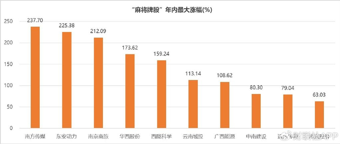 今年四季度A股市场的玄学炒作从“一条龙”蔓延到炒数字,最后演化成麻将牌炒作,可谓今年玄学行情的“巅峰之作”。东安动力、西陇科学、南京商旅、北巴传媒、中广天择、惠发食品、白云电器均走出不同程度的连板行情。而“东西南北中发白”这串神秘代码也被不少投资者成功“破译”。据统计,在“麻将牌”概念股中,南方传媒、东安动力、南京商旅、华西股份、西陇科学年内涨幅超150%。