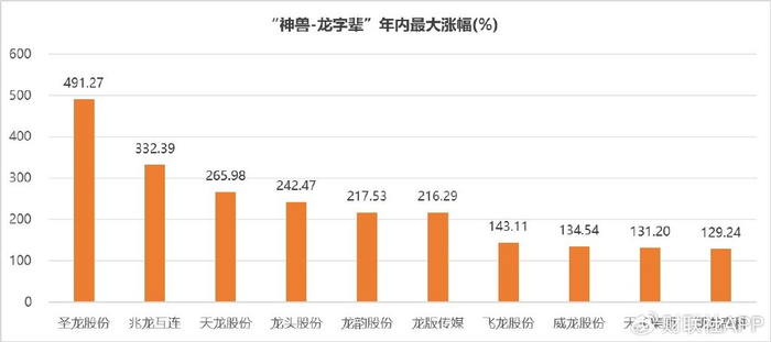 下半年手机和汽车行业掀起的一股华为热,问界M7等车型的爆火一举引燃二级市场。恰逢往年第四季度的生肖炒作传统,“炒龙热”率先刺激赛力斯供应商圣龙股份从9月28日开启连板模式,至10月25日完成14连板壮举。随后天龙股份接棒圣龙展开接力,至11月7日走出10连板。从此龙字辈股热潮贯穿至今,包括龙版传媒、龙洲股份、龙头股份、龙韵股份等均走出过阶段大涨行情。统计今年以来“龙字辈”股的年内涨幅,圣龙股份涨幅居首,兆龙互连、天龙股份、龙头股份等年内上涨超200%。