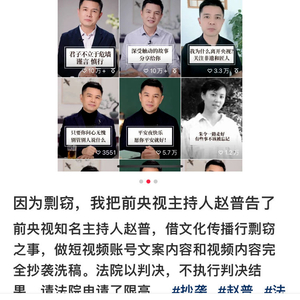 帖子称,赵普短视频账号的文案内容和视频内容“完全(是)抄袭洗稿”。法院以(已)判决,(对方)不执行判决结果,“请法院申请了限高”。