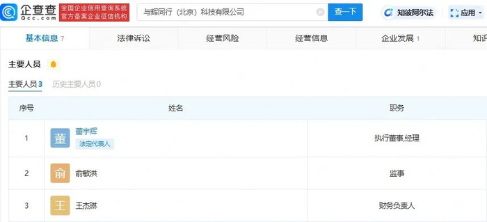 企查查数据显示,近日,与辉同行(北京)科技有限公司成立,注册资本1000万元,董宇辉为法定代表人、执行董事、经理,俞敏洪担任监事。公司经营范围包括日用品批发、互联网信息服务、出版物零售、演出经纪、营业性演出、旅游业务等。因此,不少网友开始猜测,这是否就是此前俞敏洪提到的董宇辉个人工作室相关公司?