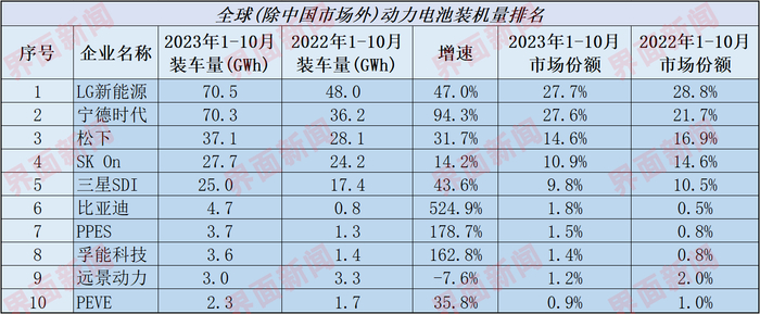 在全球前十榜单中,仅有LG新能源和松下今年前十个月的装车量增速超过去年全年。