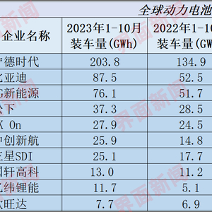 榜单中的另一项变化,是中创新航(03931.HK)完成了对三星SDI的反超,晋升至全球第六。1-10月,中创新航的市场占有率为4.7%,与第五名SK On的差距缩小至0.4个百分点。