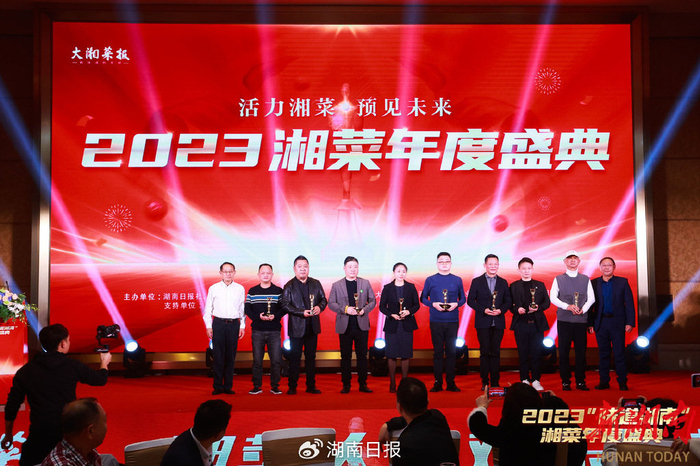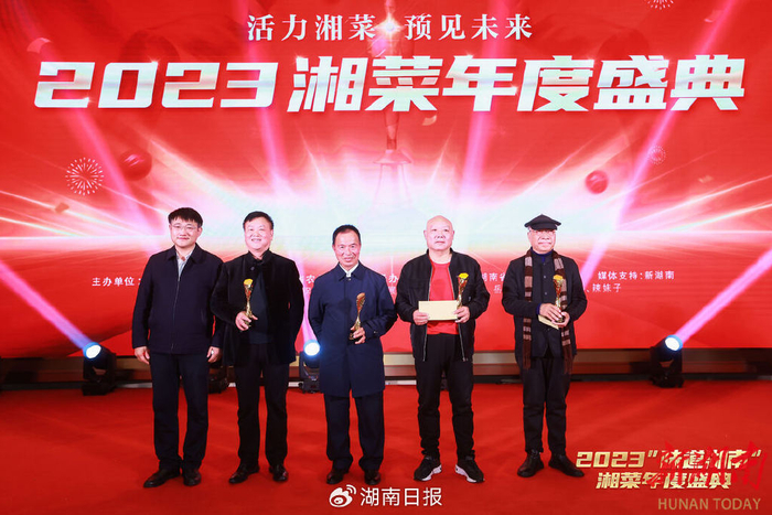 在颁奖环节中,四位年逾古稀、为湘菜产业传承和发展奉献了毕生精力的业界宿老获得终身成就奖,他们是“双艺大师”张志君、“辣椒大王”杨意红、“湘菜入京功臣”姚经建、“大陆祖庵菜第三代唯一传承人”孔起铁。湘菜新消费领域聚味瞿记品牌创始人瞿涛、湘菜预制菜产业杰出品牌“许大师”创始人陈冲、澳大利亚“八百里”新派湘菜创始人胡翔等17人获评2023湘菜年度人物。此外,还有一批湘菜头部连锁品牌及省内食品产业领军企业代表获得嘉奖。