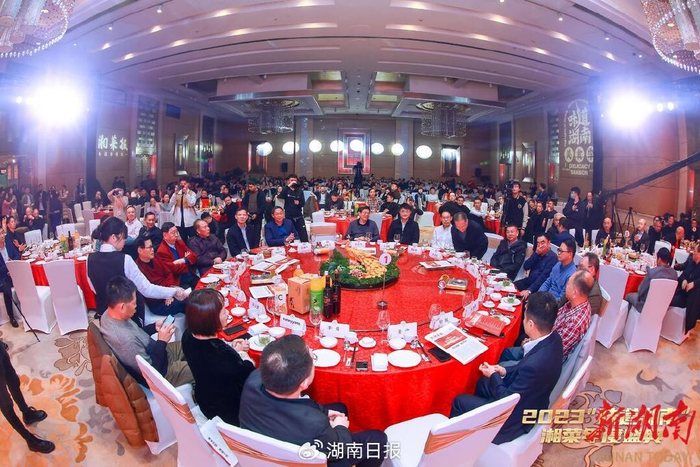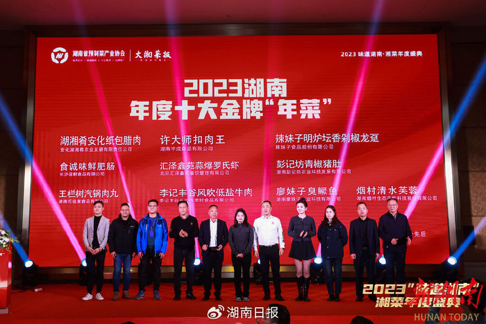 颁奖仪式结束,“潇湘盛宴”随之热辣开场。由著名湘菜大师谭兆元、徐向阳领衔的团队精心烹制了“金牌年菜”品鉴晚宴。谭口福精肉鱼肚海参、吴记禾叫堂鸡、冰火楼酸辣滩羊、许大师千层扣肉、湖湘肴安化纸包腊肉等菜品依次登场,让嘉宾们大饱口福。
