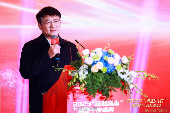 湖南日报社总编辑、总经理于金旺出席活动并致辞。他指出,2023湘菜产业正在高速发展的快车道上提质升级,湖南日报社立足主流媒体的角度,举办了中国湘菜美食文化节、米粉大擂台、湘菜澳洲行等大型活动。他表示:“希望湘菜成为中国饮食文化的独特符号。”