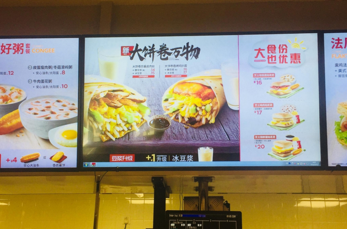 菜单上,当肯德基2004年喊出口号“立足中国,融入生活”,先后推出了老北京鸡肉卷、油条、豆浆、米饭等带有中国元素的餐点,麦当劳选择与之保持一定的距离,并在接受采访时表示,“本土化可不是做油条这么简单,我们麦当劳有自己的策略和发展方向”。