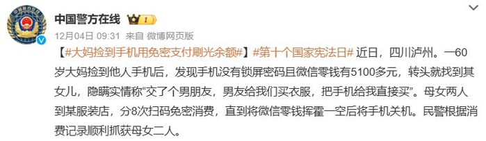 据报道,四川泸州一市民捡到他人手机后,发现手机没有锁屏密码,一看微信零钱有5100多元,分8次扫码消费(微信免密支付支持单笔订单小于等于1000元可直接付款,付款期间不需要输入密码确认),直到将微信零钱挥霍一空后将手机关机,最终被民警抓获。