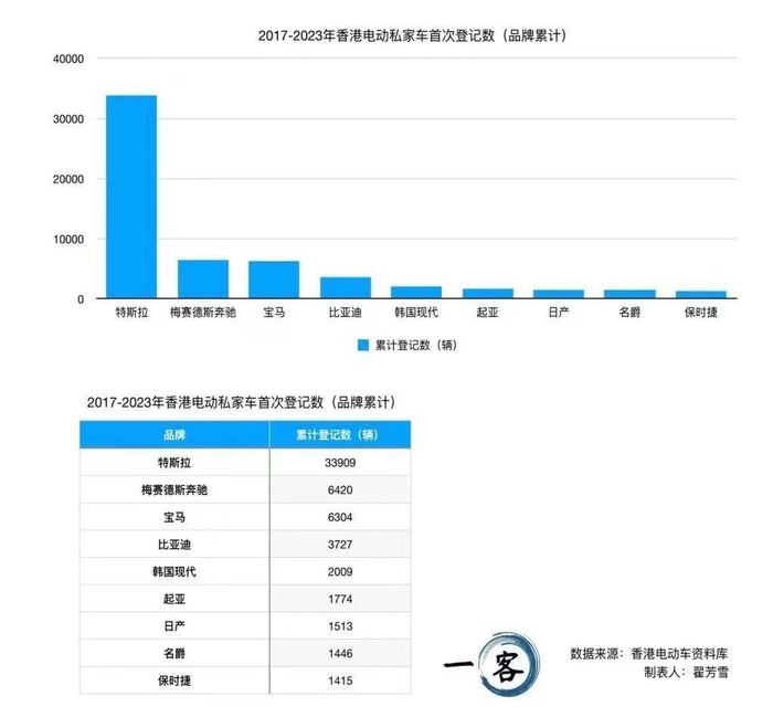 作为对比,第二名的梅赛德斯奔驰只有6420辆,不到特斯拉的五分之一。而中国内地的新能源销冠比亚迪,在香港的首次登记数只有3727辆,总占比不到6%。