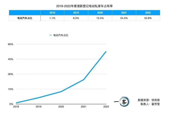 尽管保有量比不上燃油车,在过去的几年,香港新登记私家车中电动车的占比在逐年攀升。根据香港保险公司快而保给出的数据,2018年电动汽车的占比只有1.1%,而2022年已经上涨至52.8%。