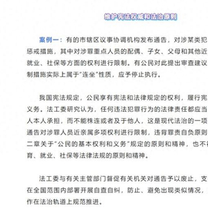 报告明确指出,地方机构限制涉罪重点人员的配偶、子女、父母和其他近亲属在受教育、就业、社保等方面权利,违背罪责自负原则,也不符合宪法中有关公民义务与权利的规定。法工委已督促废止此类通告,并支持在全国范围内开展自查自纠。