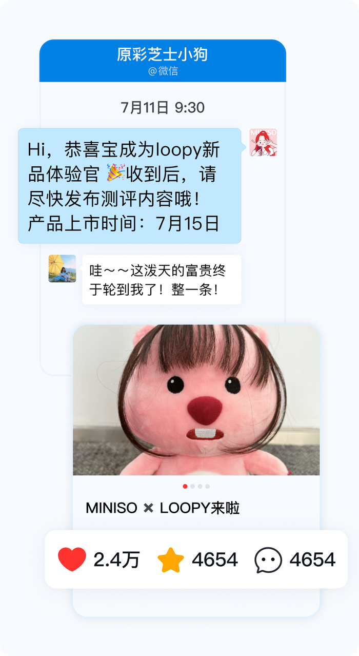 除此之外,名创优品也鼓励KOC之间互相提建议、给灵感,成为彼此的创作后援团。比如一个私域KOC首次拿到毛绒类产品,不知道怎样创作能更受欢迎时,就能在企业微信私域社群中抛出问题,跟其他KOC讨论,收获群友们的成功经验。