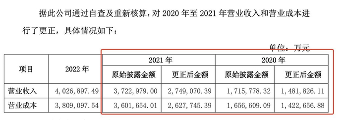 据此,国联股份通过自查及重新核算,对2020年至2021年营业收入和营业成本进行了更正。在营业收入方面,2020年由171.58亿更正为148.18亿元;2021年的营收由372.3亿元更正为274.9亿元。