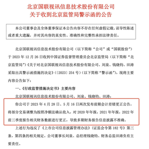 北京证监局决定,对国联股份董事长刘泉、总经理钱晓钧、财务总监田涛出具警示函的行政监管措施,并记入证券期货市场诚信档案。