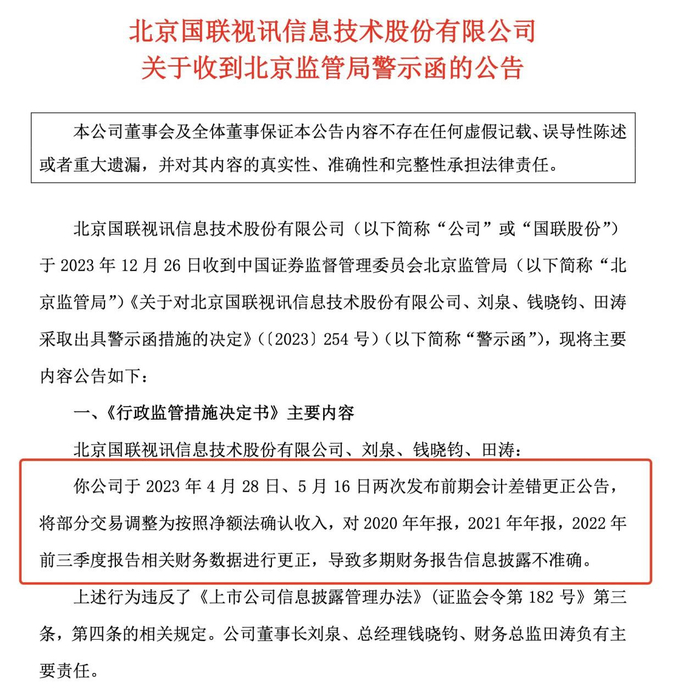 同日,国联股份发布的《关于收到北京监管局警示函的公告》显示,国联股份于2023年4月28日、5月16日两次发布前期会计差错更正公告,将部分交易调整为按照净额法确认收入,对2020年年报,2021年年报,2022年前三季度报告相关财务数据进行更正,导致多期财务报告信息披露不准确。