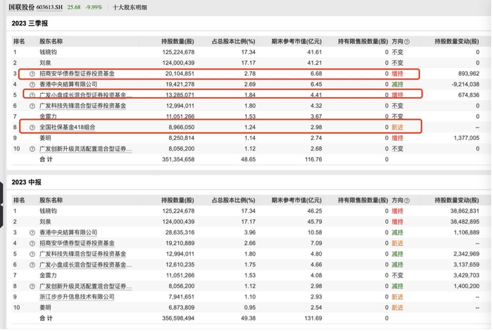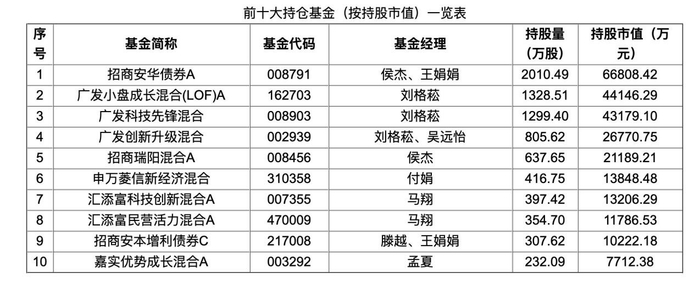 从国联股份前十大持仓基金来看,侯杰、王娟娟管理的招商安华债券,刘格菘管理的广发小盘成长混合、广发科技先锋混合,以及他与吴远怡合管的广发创新升级混合,侯杰管理的瑞阳混合,付娟管理的申万菱信新经济混合以及马翔管理的汇添富科技创新混合、汇添富民营活力混合等悉数在列。