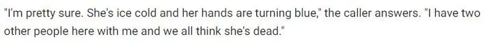 2010年1月4日上午11点30分左右,洛杉矶警局接到了一名身份不明的女性拨打了 911 电话。“她浑身冰冷,双手都变成蓝色了,”来电者说道。“我身边还有另外两个人,我们都认为她已经死了。”