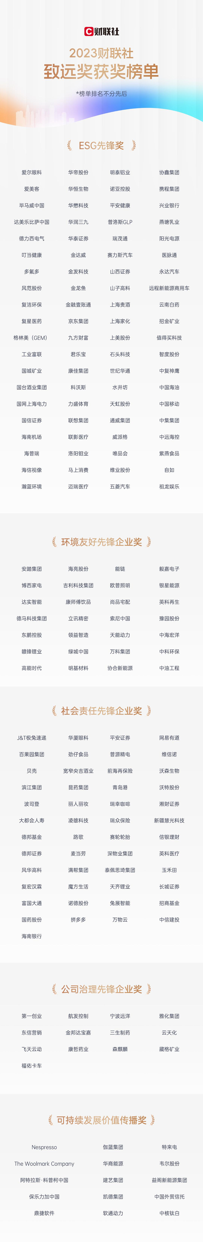 27日下午,2023“财联社·企业ESG致远奖”颁奖仪式顺利举行。本次活动,感谢活动合作伙伴宽窄巷子深、风范股份、长城葡萄酒、陆家嘴珠宝的特别支持。
