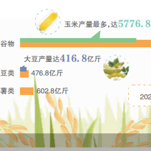 根据国家统计局数据,2023年全国粮食总产量13908.2亿斤,其中,谷物产量12828.6亿斤、豆类产量476.8亿斤、薯类产量602.8亿斤。具体来看,谷物产量中,玉米产量最多,达5776.8亿斤,高于稻谷和小麦;豆类产量中,光大豆这一品种就占了416.8亿斤。