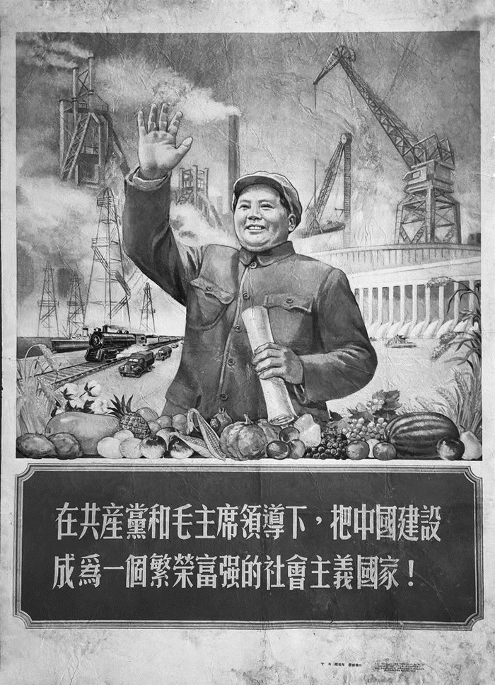 宣传画《在共产党和毛主席领导下,把中国建设成为一个繁荣富强的社会主义国家》,竖幅,高109.2cm,宽78.7cm,主画面是身穿领袖服、头戴帽子的毛主席,一只手手持我国的第一个五年计划计划书,一只手高举着,象征着号召全党、全军、全国人民行动起来向建设社会主义强国进军。画面下方是中国农业五谷丰登的具体展示:两边是饱满的麦穗和谷穗,中间排列着棉桃、蜜桃、玉米、土豆、红薯、南瓜、西瓜、冬瓜、苹果、香梨、葡萄、菠萝、石榴、西红柿,呼之欲出。围绕在毛主席周围的是热气腾腾的新中国建设场面,水上的轮船,工厂的烟囱,行进中的火车,建设中的塔吊,流水喷涌的水坝,望不到边的汽车运输队,遍布田野的高压电线塔等等。