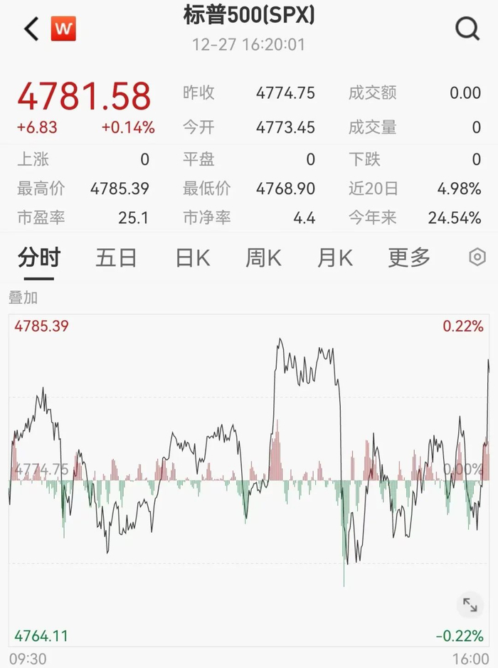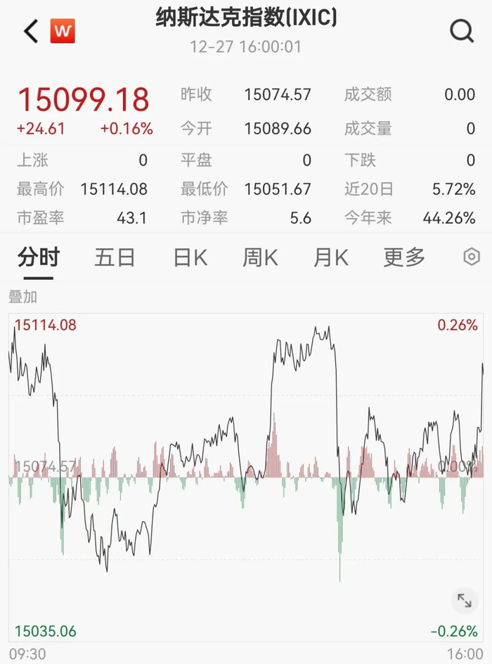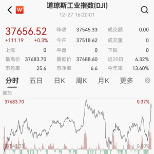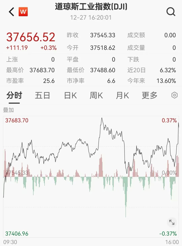 美东时间12月27日,美国三大股指小幅收涨。道指涨0.3%,报37656.52点,再创历史收盘新高。标普500指数涨0.14%,报4781.58点。纳指涨0.16%,报15099.18点。沃尔玛涨0.97%,安进涨0.93%,卡特皮勒涨0.89%,领涨道指。