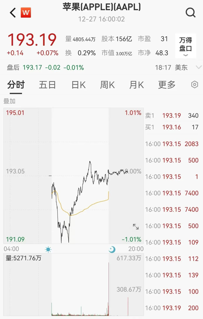 消息发布后,苹果股价由跌超1%急剧回升,最终收于193.19美元,微涨0.07%。