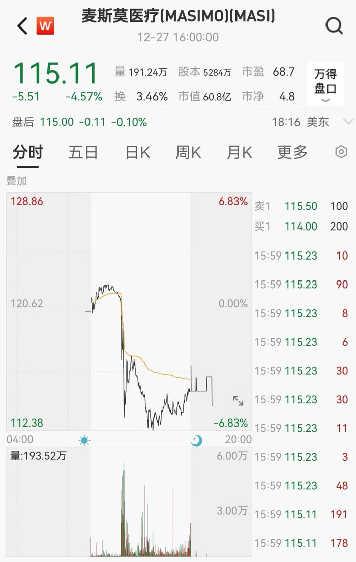 Masimo 麦斯莫医疗的股价则由升转跌,最大跌幅达6.83%,最终收于115.11美元,跌4.57%。