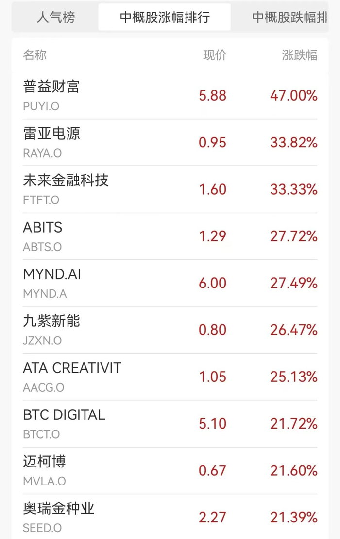 热门中概股涨跌不一。普益财富涨47.00%,雷亚电源涨33.82%,未来金融科技涨33.33%,领涨中概股。比特数字涨18.57%,嘉楠科技涨5.28%,雾芯科技涨4.76%,BOSS直聘涨3.24%,盛大科技涨2.45%,硕迪生物涨2.2%,满帮集团涨2.17%。