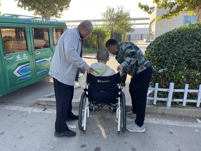 林惠芳扶董宇下楼。他的轮椅约50公斤重,在出租车司机的帮助下,我们三人合力才把轮椅塞进了后备厢。实际上,他出门很少打车,很多车的后备厢塞不下轮椅。
