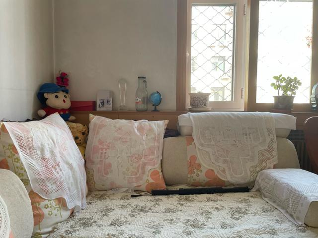 林惠芳把家里收拾得整洁,沙发上铺着蕾丝纱。