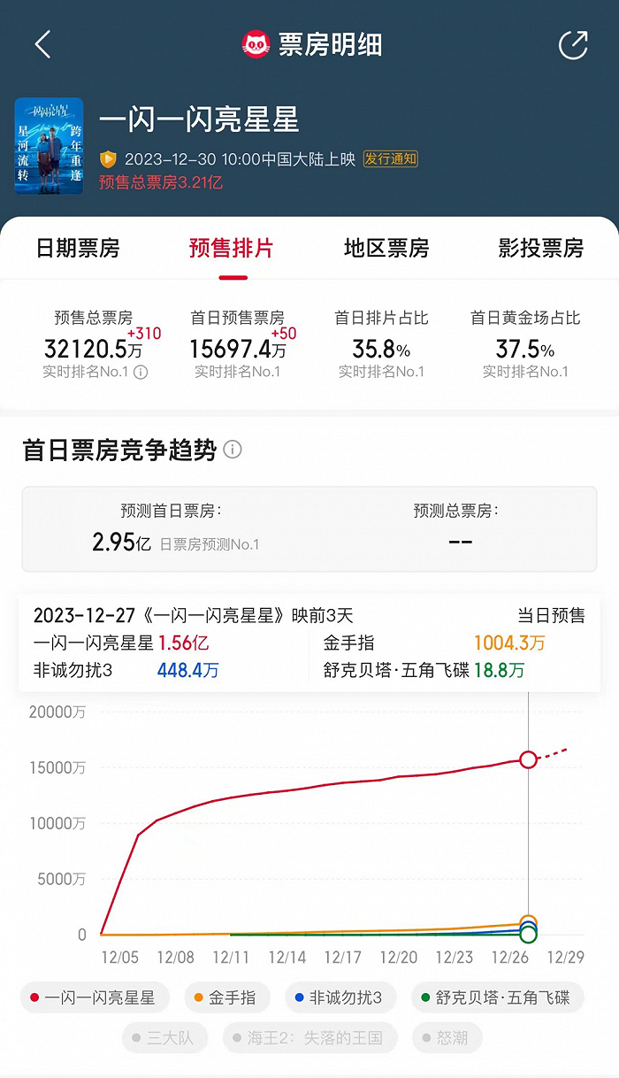 而还未上映的《一闪一闪亮星星》预售票房3.2亿,成为今年除了《前任4》外票房最高的爱情片。