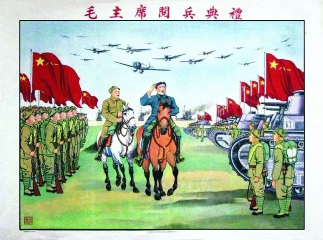 年画《毛主席阅兵典礼》,横幅,高28.3cm,宽53.8cm。画面是以毛主席、朱总司令西苑阅兵为历史背景的艺术创作,左下角盖有绘画者的印章。众所周知,1949年3月25日,位于北平西郊的西苑机场,中共中央、中国人民解放军总部从西柏坡移至北平。中午时分,西苑机场已聚集了很多前来欢迎的各界人士。下午3时,礼炮轰响,毛主席与各党派人士和民主人士一一握手。接着,雄壮的乐声响起,检阅车队马达齐鸣,毛主席在检阅车上挥手致意,朱总司令在敬军礼。而这幅年画的画面上,却是毛泽东着中山装骑着枣红马在敬军礼,朱德戎装骑着大白马紧随其后,天空中飞来战机,受阅部队分列左右,中国人民解放军的八一军旗高高飘扬,一边是持枪列队的步兵,一边是威武的坦克阵容。表现的正是中国共产党夺取全国政权进京“赶考”的重大历史事件。