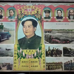 宣传画《中华人民共和国人民领袖》,横幅,高53.3cm,宽76.9cm。画面居中大幅的是毛泽东主席新中国成立初期标准画像,上部用齿轮,两边用麦穗,下部用五谷丰登的枝叶装饰,有局部借用国徽轮廓的痕迹。毛泽东画像下部的豆黄底色上印有文字,左右对称的大字是“人民武装力量,保卫世界和平”。中间是“繁荣经济,公私兼顾,发展生产,劳资两利”,用红色五角星间隔,这是对新中国成立初期党中央十六字方针的宣传。画面上部用多面五星红旗装点,一边是刘少奇、李济深、高岗副主席头像,另一边是朱德、宋庆龄、张澜副主席头像。毛泽东画像的两边,各由5幅新闻图片组成,一边是朱德总司令站立在敞篷车上检阅部队的威武形象。接下来是高射炮队、空军部队、装甲部队和坦克车队特写照片。另一边是新中国人民武装部队在天安门广场前接受检阅的壮观场面。接下来是骑兵部队、步兵部队、海军部队等的特写照片。