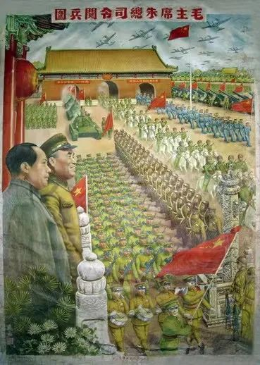 年画《毛主席朱总司令阅兵图》,竖幅,高78cm,宽53.9cm。画面上,毛主席和朱总司令站在天安门城楼一侧,全神贯注地检阅着受阅队伍,毛泽东身着的中山装显然与开国大典时的着装颜色大有不同,朱德身着解放军新式军服,头戴“大壳帽”,受阅队伍不同兵种着装区分明显。可以确定画面反映的是中华人民共和国成立后国庆周年阅兵。
