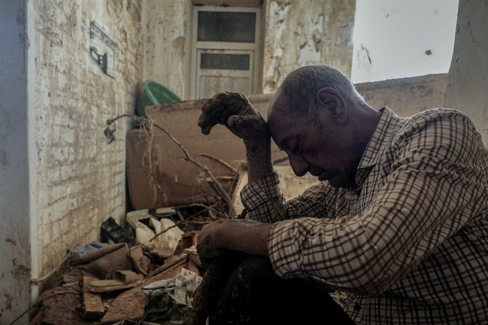 当地时间2023年9月17日,利比亚德尔纳,当地遭飓风袭击,69岁的Hassan Kassar坐在受损的房屋内。他的女儿、两个儿子和孙女在飓风中不幸遇难。