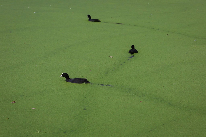 当地时间2023年9月6日,英国伦敦,黑色水鸟白骨顶在长满浮萍的湖面游来游去。由于天气温暖,浮萍大量繁殖,水生动物生存所需的氧气不足,动物生存受到威胁。
