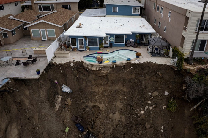 当地时间2023年3月16日,美国加利福尼亚州,冬季风暴带来新一轮暴雨并引发山体滑坡,一私家泳池在悬崖边“摇摇欲坠”。