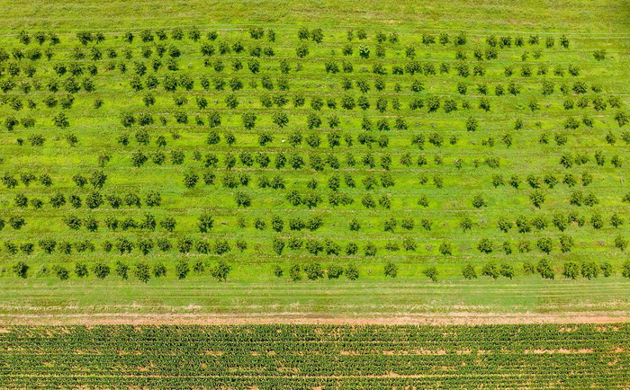 当地时间2023年7月12日,美国佐治亚州,康科德Gregg农场,航拍果园里贫瘠的桃树。高温影响导致美国农作物产量大幅降低。