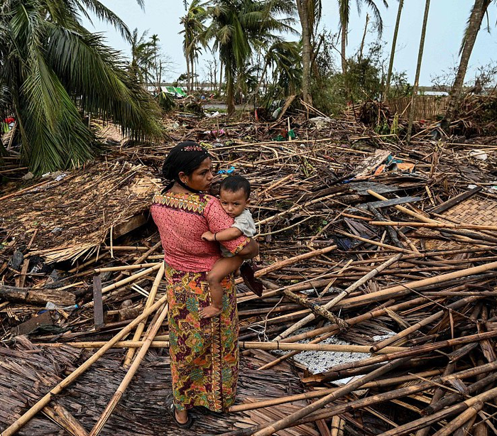 当地时间2023年5月16日,热带气旋“穆查”袭击缅甸实兑,一名罗兴亚妇女抱着她的孩子站在被摧毁的房子旁边。