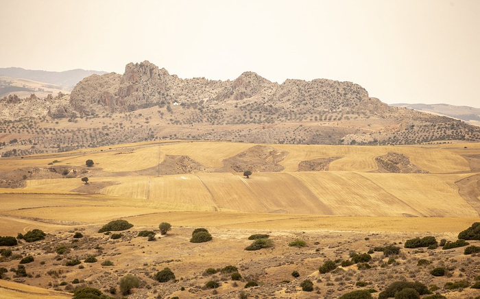 当地时间2023年5月6日,突尼斯,俯瞰受干旱影响的小麦田。降雨量达到近年来最低,干旱影响了当地的粮食产量和牲畜情况。