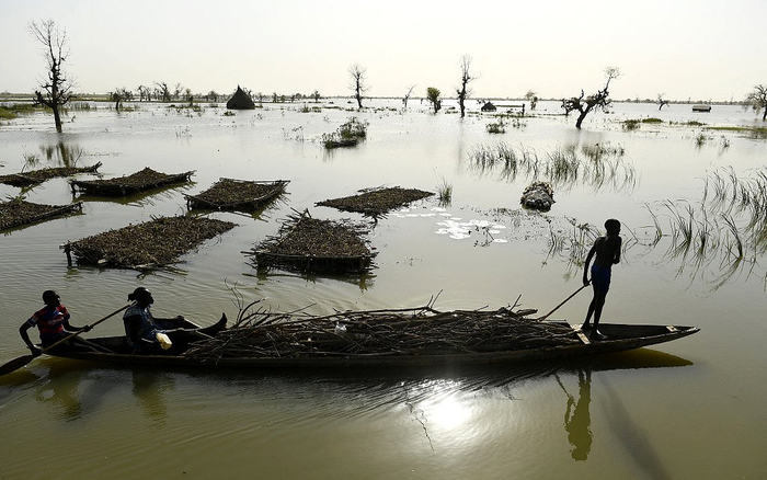 当地时间2023年2月7日,南苏丹本提乌,人们用小船运输柴火。南苏丹连续四年遭受洪水灾害,已淹没南苏丹三分之二的土地。