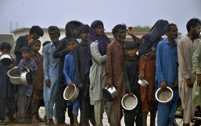 当地时间2023年6月15日,巴基斯坦信德省南部Sujawal,由于气旋风暴“比帕乔伊”的侵袭,人们在雨中排队等候志愿者分发的免费食物。